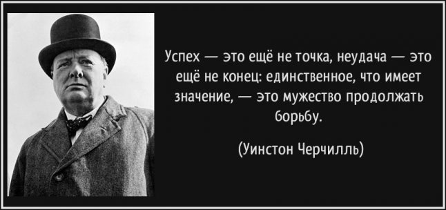 В 93 года один из британских университетов пригласил Уинстона Черчилля прочитать лекцию, рассчитывая услышать длинную скучную речь престарелого политика о своей жизни, невероятно насыщенной судьбоносными для станы событиями. И вот под бурные аплодисменты на трибуну поднимается Черчилль, произносит: «Никогда, никогда, никогда не сдавайтесь» и уходит. Зал онемел и окаменел. Лишь не многие поняли, что речь закончена и осознали её глубочайший смысл. Эта самая короткая речь Уинстона Черчилля, отражающая истинную суть победителя, стала одной из самых известных в истории мира. Черчилль знал, что так и будет, и опять стал победителем. Но Уинстон Черчилль был не из робкого десятка. Он считал: если ты прекратил борьбу, ты проиграл.