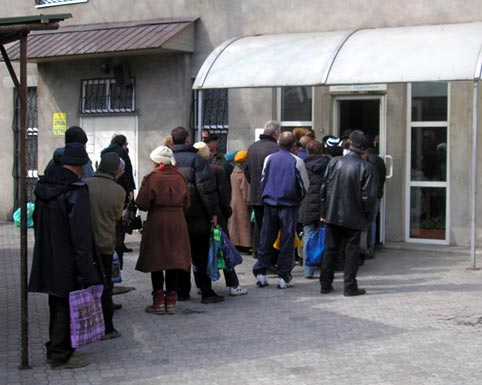 В очереди тихо и спокойно. Нет драки или криков. Все, независимо от возраста и пола, терпеливо дожидаются того момента, когда можно будет зайти в столовую Фото С. Чумаченко