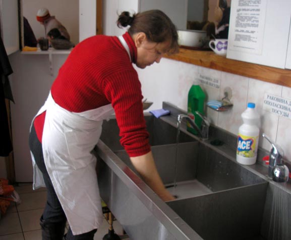 Волонтерам приходиться в день мыть сотни тарелок и ложек. Все они проходят тщательную дезинфекцию.
