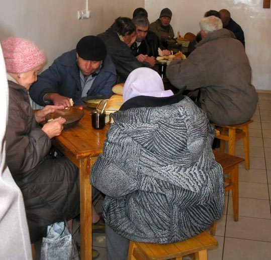 Пожилых и стариков пускают первыми в столовую. Так принято – подростки заходят позже. К сожалению, все обедающие отказались фотографироваться, но мне удалось сделать один снимок