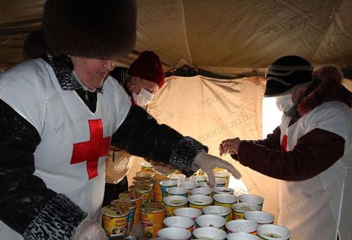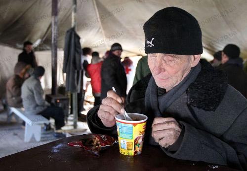 В Запорожской области с 26 января действуют пункты обогрева и горячего питания, организованные службой МЧС совместно с обществом Красного Креста. В лютые морозы все нуждающиеся могут здесь обогреться, съесть горячую мивину с сухариками, выпить горячего чаю. Те, кому некуда больше идти, могут остаться в пункте обогрева на ночь. Например, ночевать в палатке в районе Малого рынка в Запорожье остается около 15 человек. Среди бездомных — бывшие заключенные, которых родственники выгнали из дома, беременные женщины, целые семьи бомжей и даже беженцы из Армении...