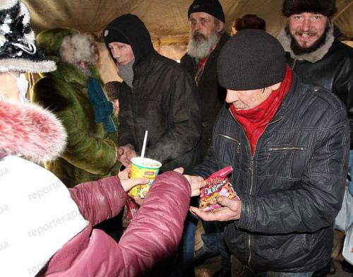 Немаловажно отметить, что запорожцы помогают бездомным и материально. Свидетелями этого как раз и стали корреспонденты "РепортерUA". Один мужчина, даже не заходя в палатку, передал 50 гривен. Рассказывать что-то о себе он не захотел.