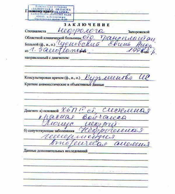 Диагноз: ХЗП - IV ст., системная красная волчанка, люпус нефрит. Вторичная анемия.