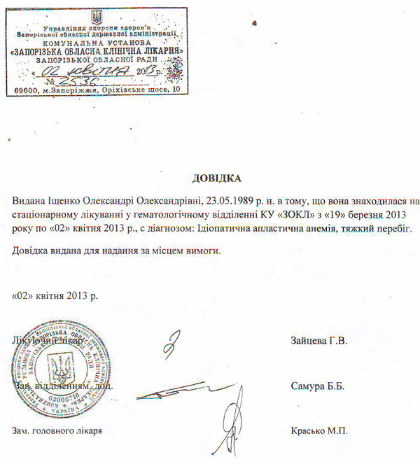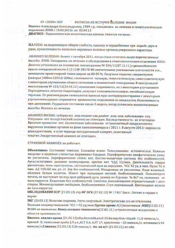 Первые симптомы недуга проявились в ноябре 2011 года, когда слабость и головокружения заставили Александру обратиться к врачу. Анализ крови показал снижение уровня гемоглобина до 37 г/л, что является одним из проявлений патологических изменений в кроветворной системе организма. Девушку направили в Запорожскую областную клиническую больницу, где после ряда обследований был поставлен страшный диагноз: идиопатическая апластическая анемия.