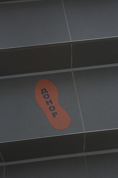 Когда анкета была заполнена, Дима пошел в отделение. Оно на втором этаже. Чтобы доноры не заблудились, на полу всюду наклеены оранжевые пятки с надписями. Удобно.