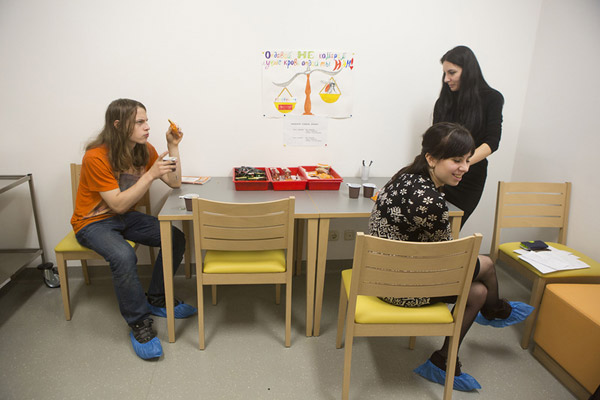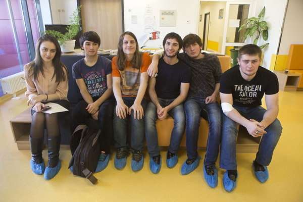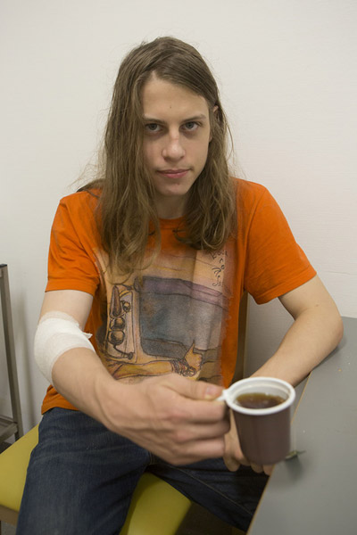 Дима съел столько печенек, сколько полагалось по инструкции, а чай мы взяли с собой, чтобы вызов не пропустить, и сели с чаем перед кабинетом, где берут кровь. Вместе с нами ждали развеселые студенты из медицинской академии, которые чуть ли не всей группой пришли. Они услышали, что у Димы день рождения, поздравили его и стали вместе с Димой фотографироваться.