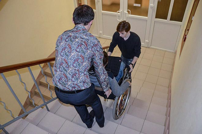 Жене помогают спуститься два парня — его друг и работник деканата. Все, кто идет навстречу, предлагают помощь. Попасть Жене в аудиторию помогаю я. Я везу коляску впервые и врезаюсь в парту. Краснею, бледнею и прошу прощения. Женя шутит: «Сразу видно, что у тебя прав нет». Со словами «на помощь идет опытный водитель» ко мне подходит Женина одногруппница. Но и она застревает с коляской между партами. Все смеются и дружно раздвигают парты. В этой группе — ни тебе великомученического пафоса, ни гордости за помощь страждущим. Такое ощущение, что с парнем на коляске им даже веселее.