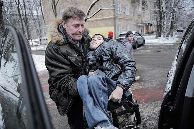 На первый взгляд, в подъезде трудностей с передвижением возникнуть не должно: всего семь ступенек, есть съезд. «Самостоятельно лестница в подъезде не преодолима, — разбивает мои иллюзии Женя. — Это же обыкновенная лестница с двумя полозьями для детских колясок. Пытаться съехать самому — это самоубийство». Алексей аккуратно свозит коляску. У подъезда — две ступеньки и пандус, его по просьбе Жениных родителей сделал муниципалитет; правда, пришлось переделывать, сначала он был слишком крутым. Вообще, пандусы, которые мы видим на улице, после установки никто не тестирует, и в большинстве случаев для инвалидов они непригодны — либо съезд опасный и неудобный, либо пандус ведет в яму, в лужу или на скользкую поверхность. Даже в хваленом парке Горького некоторыми пандусами пользоваться нельзя. По словам Жени, он передвигается только «на папе». В метро есть отдельные подъемники, но безбарьерные пространства разделены преградами, которые самостоятельно Жене не преодолеть. «На многих зданиях есть кнопка вызова специалиста, — рассказывает Женя, — но она либо не работает, либо специалиста нет. Туалеты для инвалидов если и есть, то закрыты. Нужно договариваться, чтобы вахтер убедился, что ты действительно инвалид, и пришел с ключом. Однажды я собрался в Пушкинский музей. Предварительно звоню, мне говорят, что все приспособлено. Приезжаем — а там лестница длиной как взлетно-посадочная полоса. Вся приспособленность этого здания заключается в том, что к тебе приставляют охранников, которые переносят коляску по лестнице. Я был на электрической коляске, она весит 60 килограммов. Мой подъем выглядел так: сидит Женя на кресле, и четыре раба тягают его вверх. Музей я посмотрел — хорошо, что хотя бы так, но о приспособленности тут говорить не приходится».