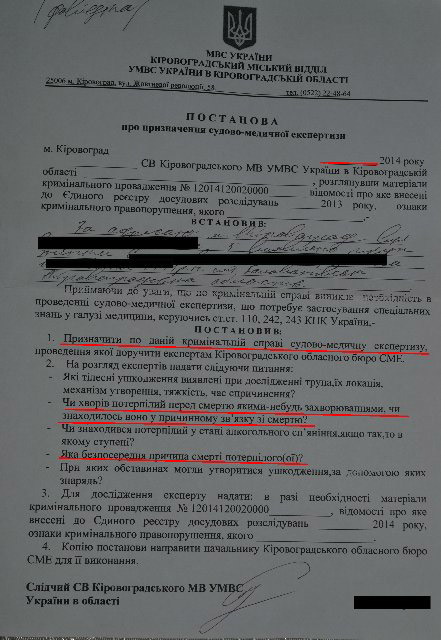 - Моя бабуся була смертельно хворою. Ми з лікарями боролися за її життя стільки, скільки могли, але прийшов час, коли варто було готуватись до найгіршого. Не тільки психологічно, а й формально. Ті, хто лікував бабусю вонкодиспансері, розповіли, що ми маємо зробити, коли її серце зупиниться. Ми хотіли, щоб після смерті бабусю перевезли до моргу Кіровоградського онкологічного диспансеру (тим паче, що ми живемо неподалік від нього), тому що саме там, як ніде, знали що саме потрібно робити з тілом померлої. Нам сказали: бабуся у такому стані, що проблем із визначенням моргу, а тим паче реєстрацією смерті, не буде. Це підтвердив і терапевт, який бачив бабусю за кілька днів до смерті і зробив відповідний запис у її картці, щоб ми потім показали його в міліції. Проте, коли це сталось, представники правоохоронних органів практично без слів видали довідку про необхідність перевірити чи бабуся померла своєю смертю. Хоча ми мали всі необхідні документи, які, до речі, є відповідями на кілька пунктів їх постанови. Вони простовідмовилисяїх подивитися. Бабуся помирала дуже страшно. Вона втратила дуже багато крові (через тяжку стадію гінекологічного раку), яка не зупинялась і після смерті. І замість того, щоб нормально підготувати тіло покійної допроводів в останній путь у моргу за кількасот метрів від нашого будинку, її закривавлене тіло «протрусили» нашими прекрасними дорогами аж на селище Нове. Добре, що ми вчасно отримали довідку про смерть і нам вдалось уберегти бабусю від розтину — знущання над її змученим від хвороби тілом.