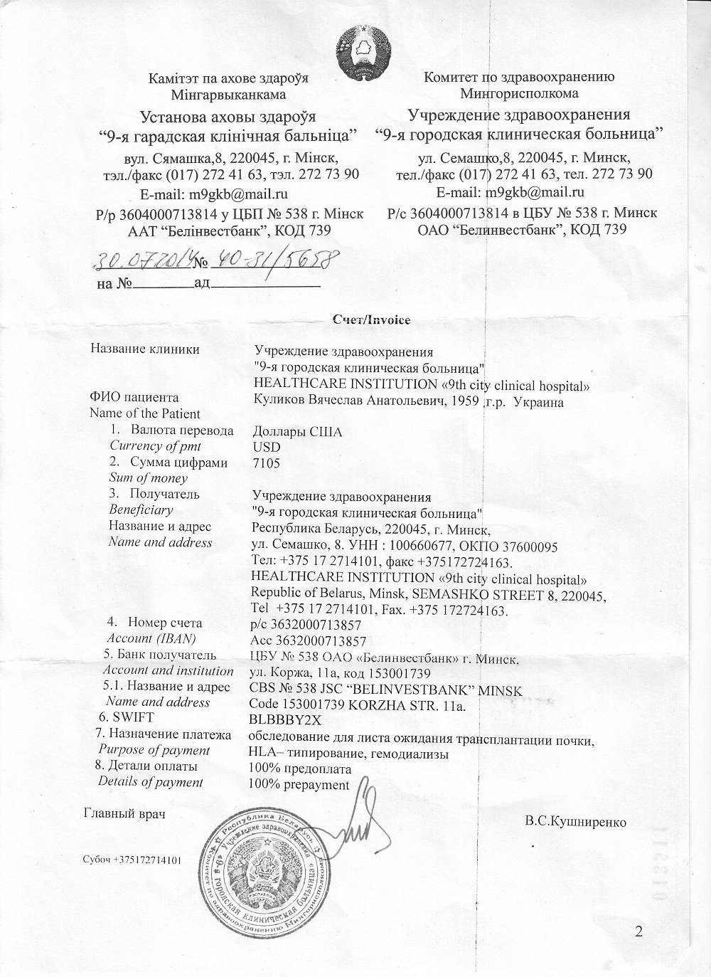Счет за лечение в Беларуси: стр.1, стр.2