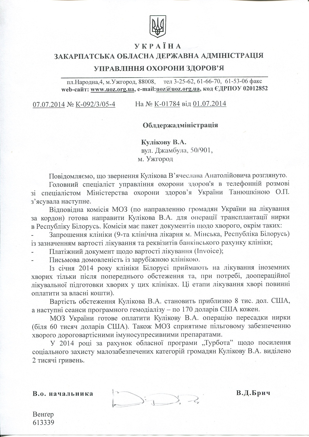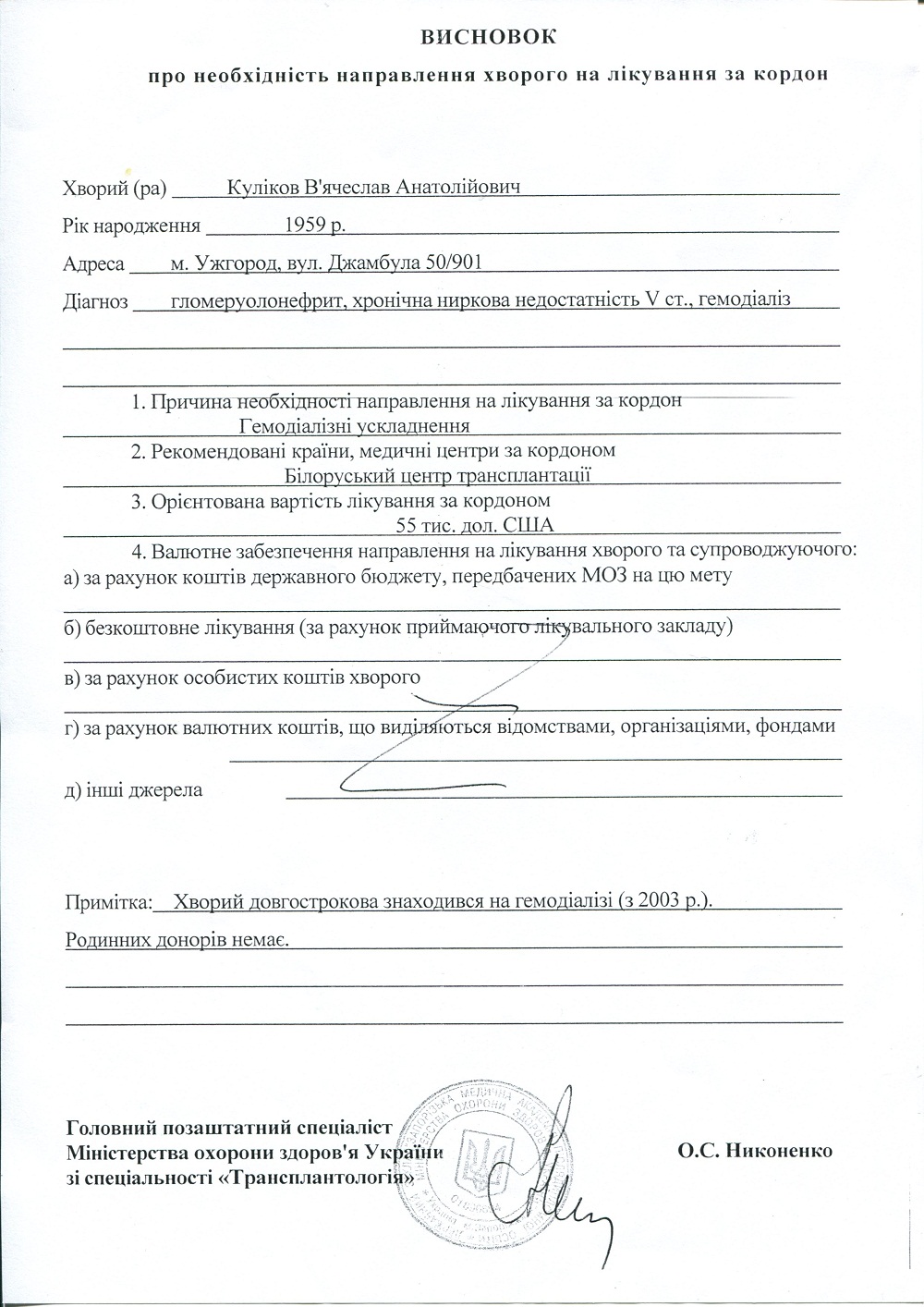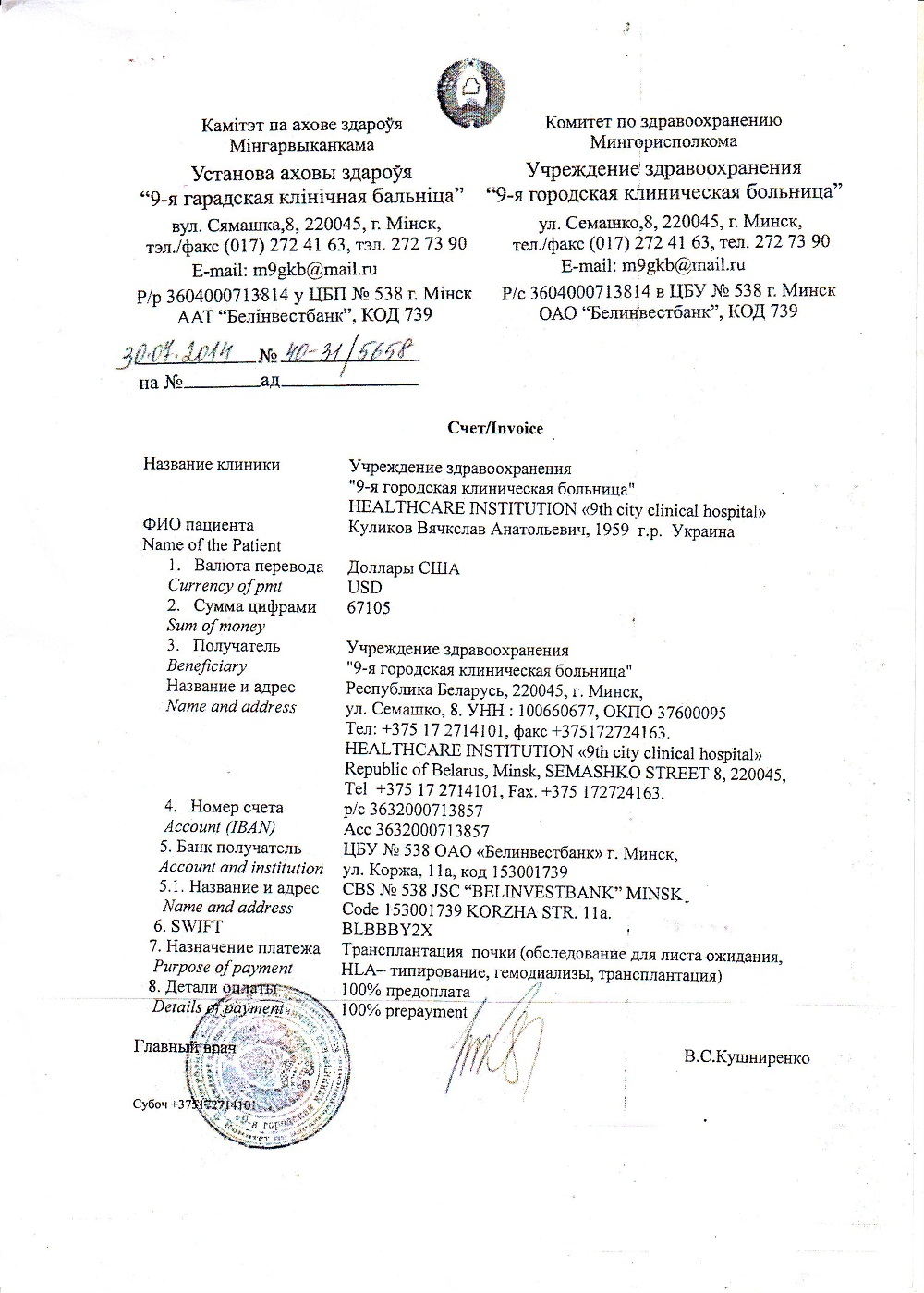 Мы обратились в Беларусь, они согласны сделать операцию но только после полной 100% предоплаты их обследования и предоперационной лечебной подготовке к операции. Они выставили нам инвойс - счет это 67105 долларов США. Это для нас космическая сумма. Так как мы простая семья, муж и один сынишка больные и на пенсии, младший сынишка еще школьник, а я работаю медсестрой.