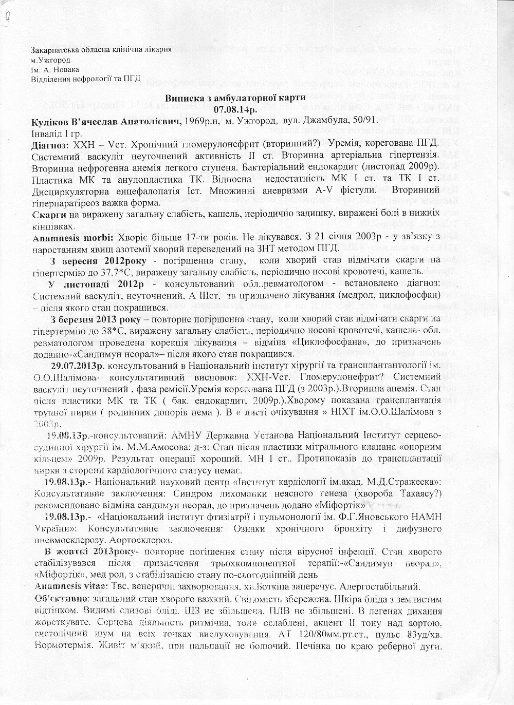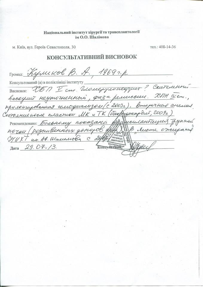 Сейчас наша семья находимся на грани жизни и смерти, выживаем как можем.. Муж ходит на гемодиализ уже 12-год ( искусственная почка) через день. Но полтора года назад, к этому заболеванию присоединилось еще автоиммунное заболевание- васкулит. Это заболевание требует постоянного приема имунодипресантов. Для того чтобы жить- каждый день нужно принимать эти препараты и еще много других лекарств. На месяц нам лекарства обходятся в 16 000 гривен. Мы обращались за помощью ко всем знакомым, и только благодаря им мы пока живем...