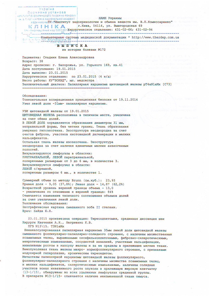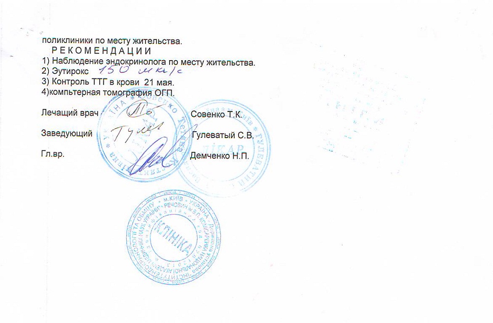 На обследование в институт эндокринологии в г.Киев, Елене необходимо приехать 21 мая 2015года. До этого времени ей нужно пройти обследование :компьютерная томография ОГП, анализы на гормоны УЗИ шейных лимфаузлов всего на сумму около 3000 гривен.