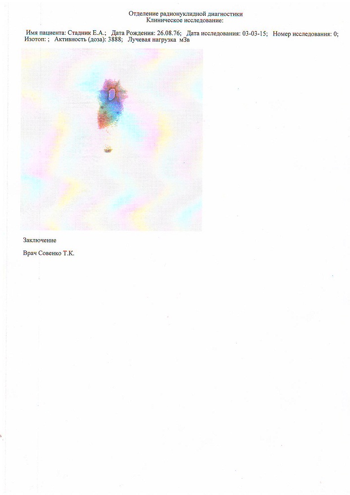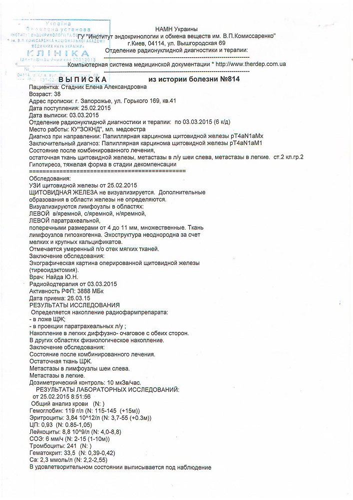 25.02.2015г. Нашей Елене была планово проведена радиойодтерапия . Процедура не из легких, во время данного лечения пациент выпивает радиационный и закрывается в изолированной палате, примерно на 5 дней. Выпитый йод впитывается в пораженные онкологией органы и начинает там свою борьбу с болезнью.