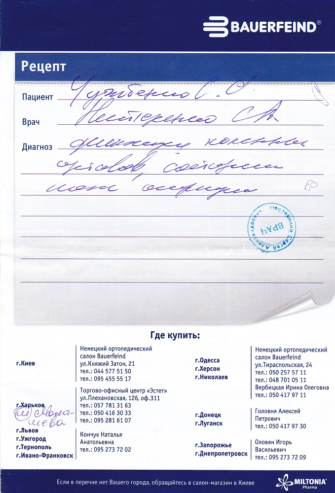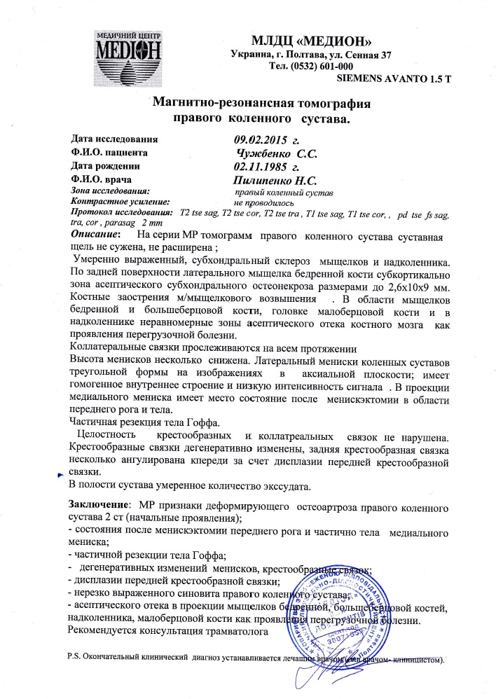 При обращении к своему лечащему врачу (г. Харьков, «Институт патологии хребта и суставов» им. Ситенко, отделение спортивной травматологии), мне было назначено срочное лечение, так как пошел воспалительный процесс в колене. Воспаление вызвано тем, что идёт процесс старения сустава и распадаются хрящи. Примерная стоимость лечения 60-70 тысяч гривен, а если не проходить курс лечения каждые полгода, то придется менять сустав на искусственный, а это приблизительно 11-13 тысяч евро. Начало лечения назначено на конец мая 2015 года.