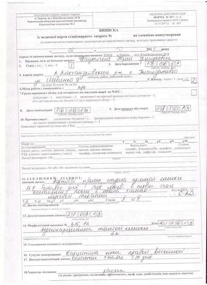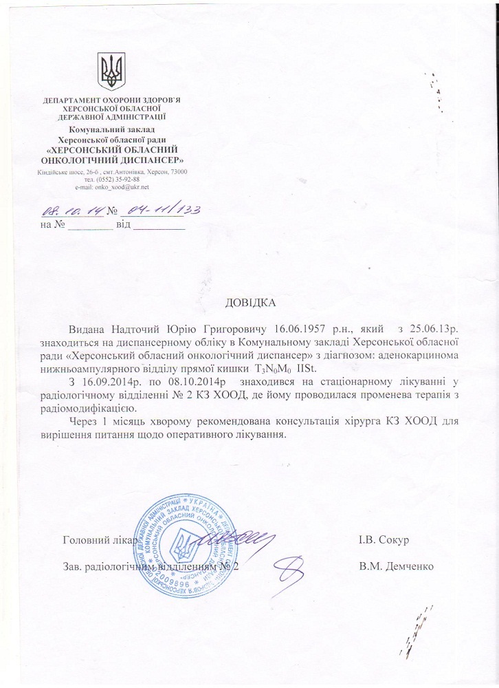 Болезнь у меня обнаружили в июне 2013 года в Херсонском областном онкологическом диспансере, где поставили на учет. Уже дважды, в июне –июле 2013 года и сентябре –октябре 2014 года проходил лучевую терапию с радиомодификацией.