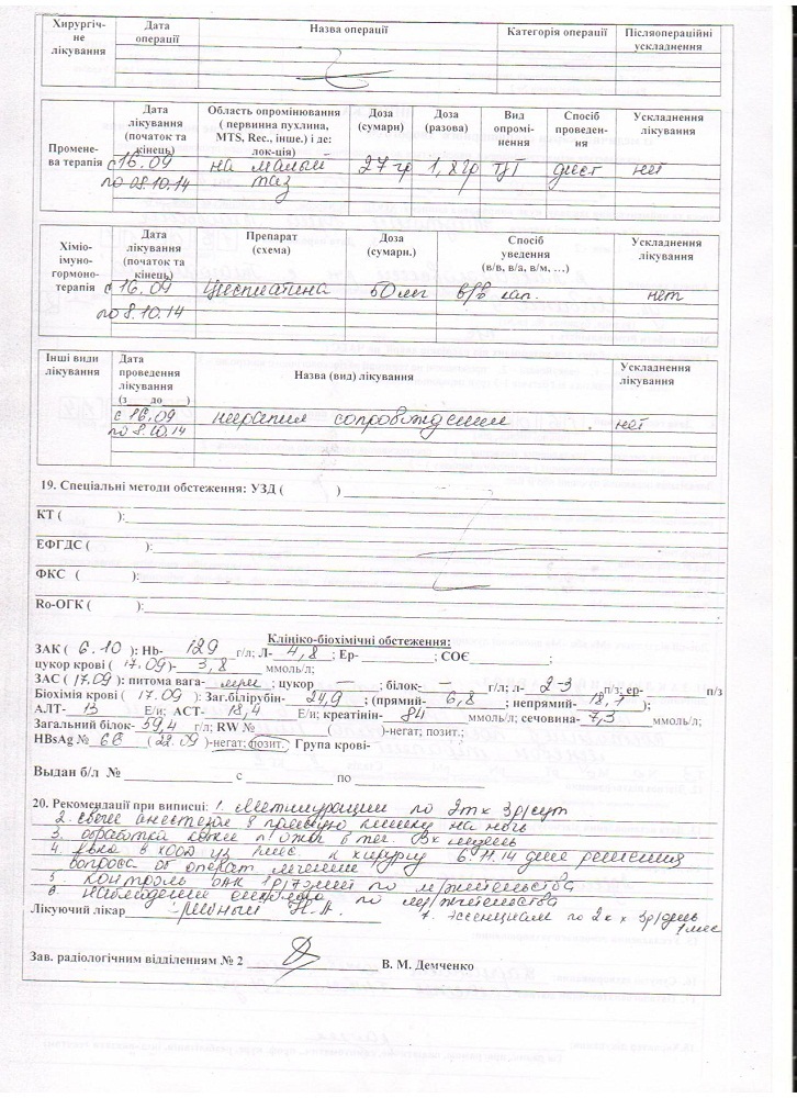 В сентябре-октябре 2014 года ( справка № 04-11/133 от 08.10.2014 г) я снова прошел новый курс лучевой терапии с радиомодификацией. Опять дорогостоящее лечение и медикаменты, плюс амбулаторное лечение дома дорогими препаратами. В этот раз, на все это у меня ушло 5900 гривен. Мой бюджет израсходован полностью, на операцию денег нет, и сам я их уже не смогу собрать.