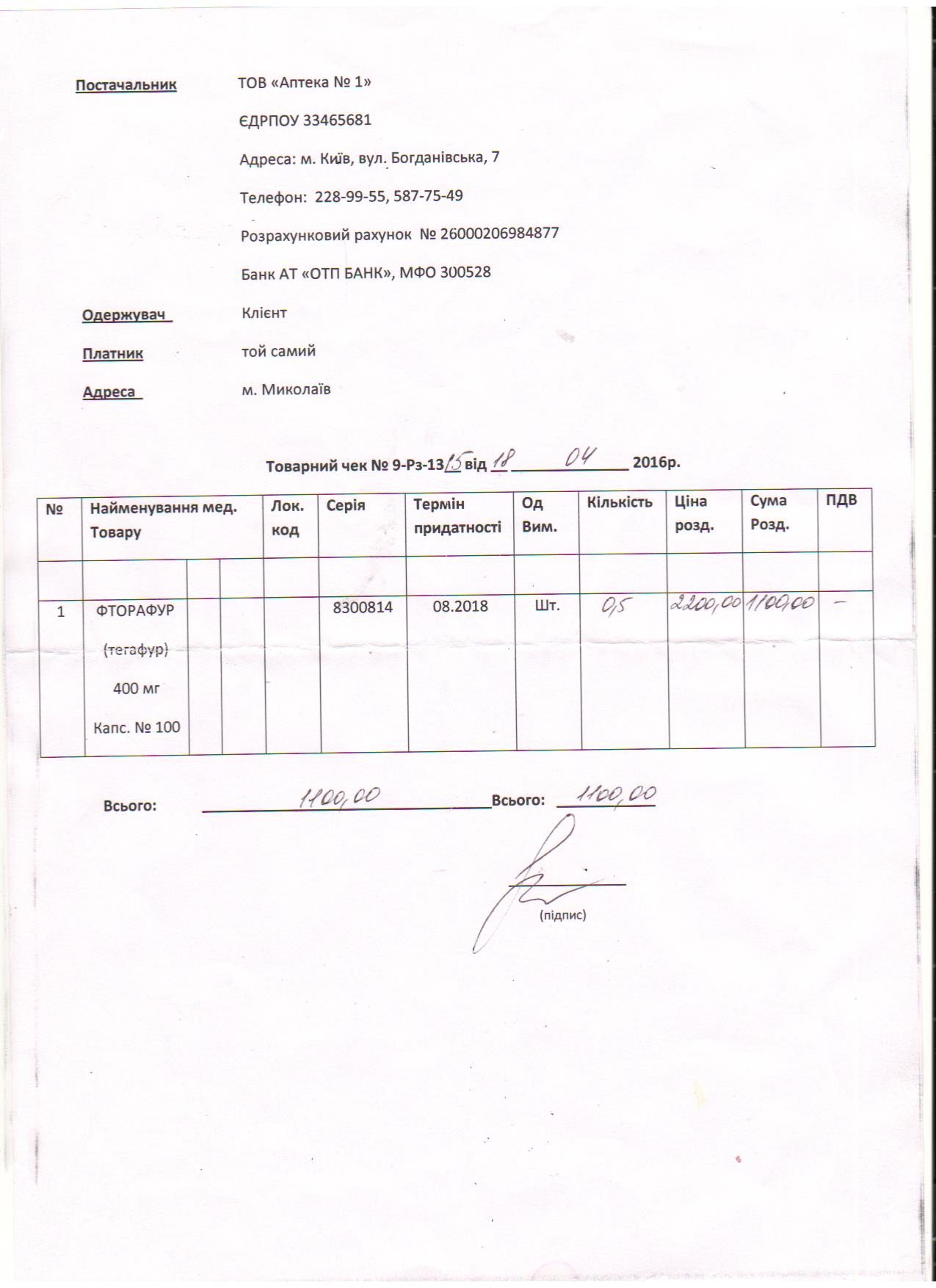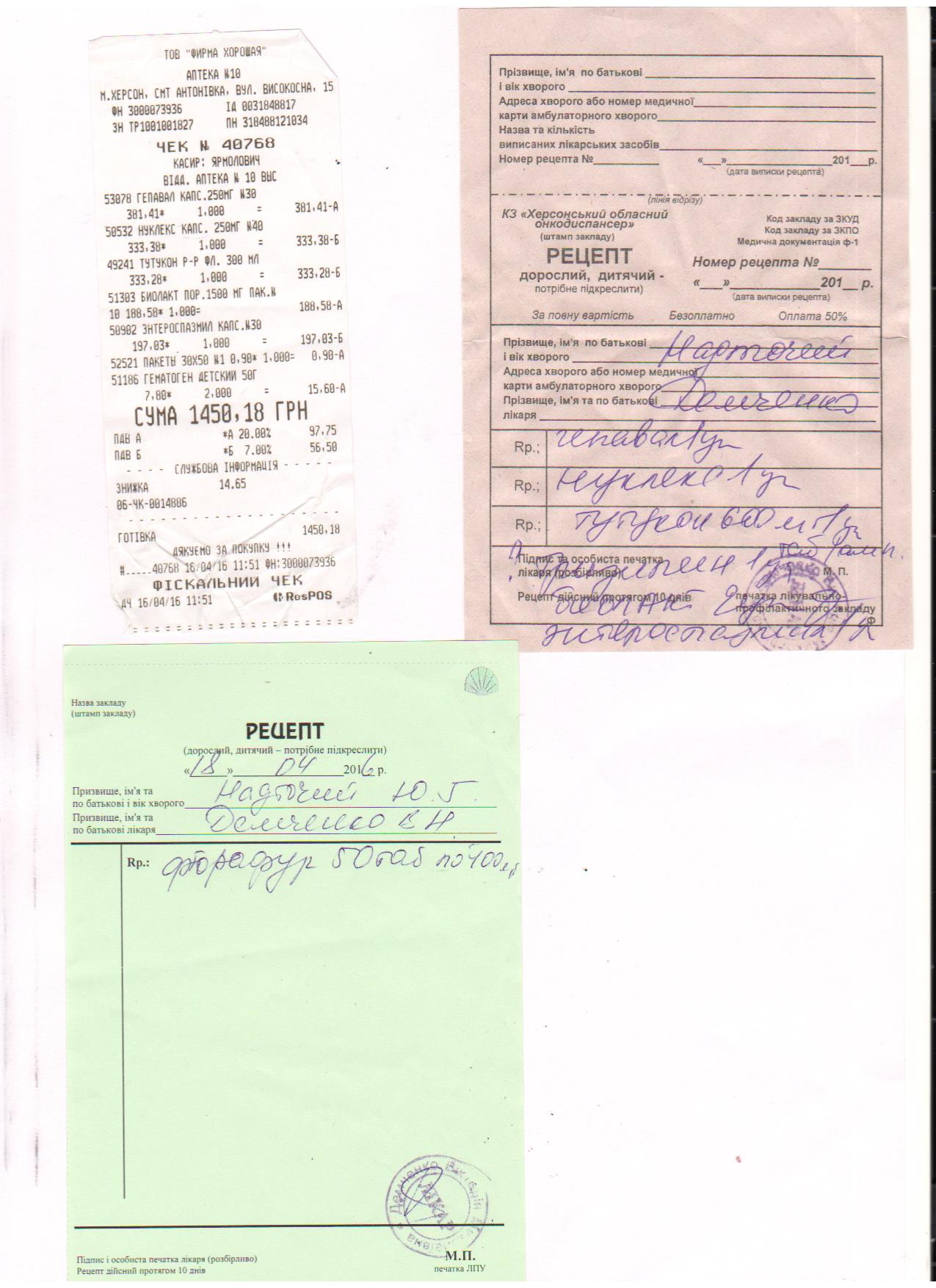 Сейчас мое здоровье ухудшилось - появились последствия пройденных «химий»: упал гемоглобин, ослаблен иммунитет, даже обычную простуду переношу очень тяжело, все болит. Но я стараюсь держаться и бороться за каждый день своей жизни. Об операций думать не приходится, сумма операции увеличилась до 50 000 гривен. Где я их возьму??? Думаю о том, чтобы хоть продлить свои дни проходя очередной курс « химии». Так с 07.04.2016 г. по 06.05.2016 г. проходил курс очередной химио-лучевой терапии. Потрачено было около 7 000 гривен, то есть все что собрал: моя пенсия, помощь небезразличных людей, плюс еще немного одолжил у соседей, не хватало нужной суммы для покупки таблеток(таблетки фторафур – стоимость 2200 грн., сканкопии рецептов прилагаю, это лишь малая часть потраченной суммы.).
