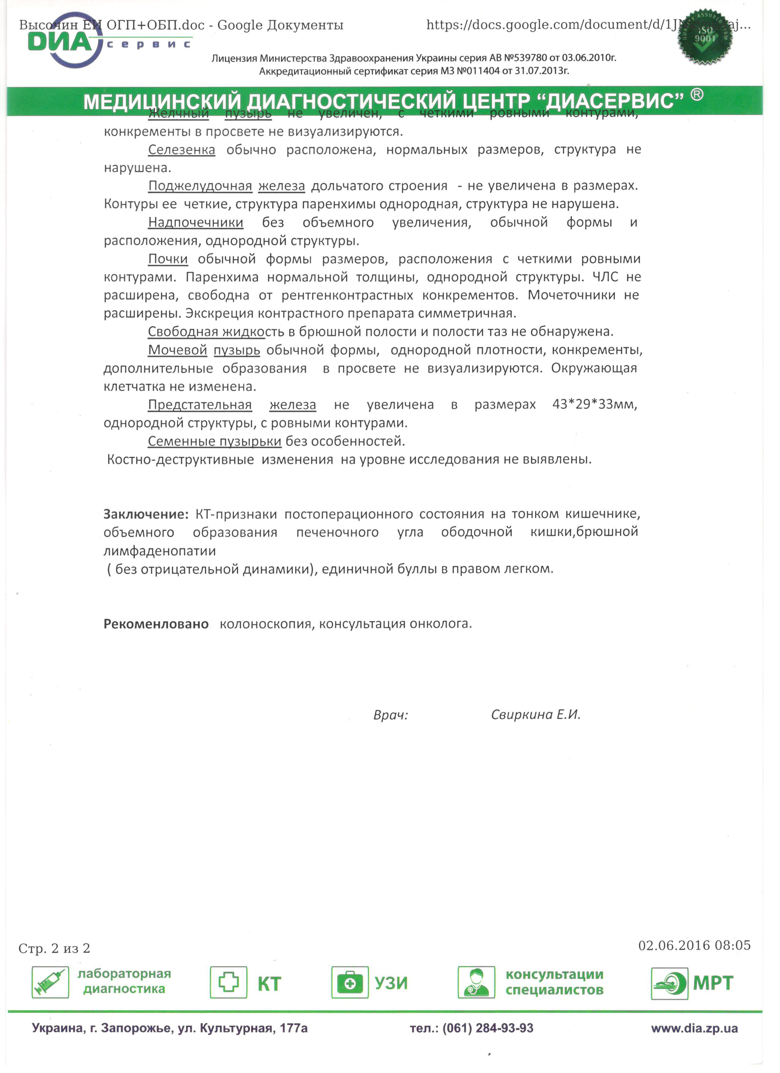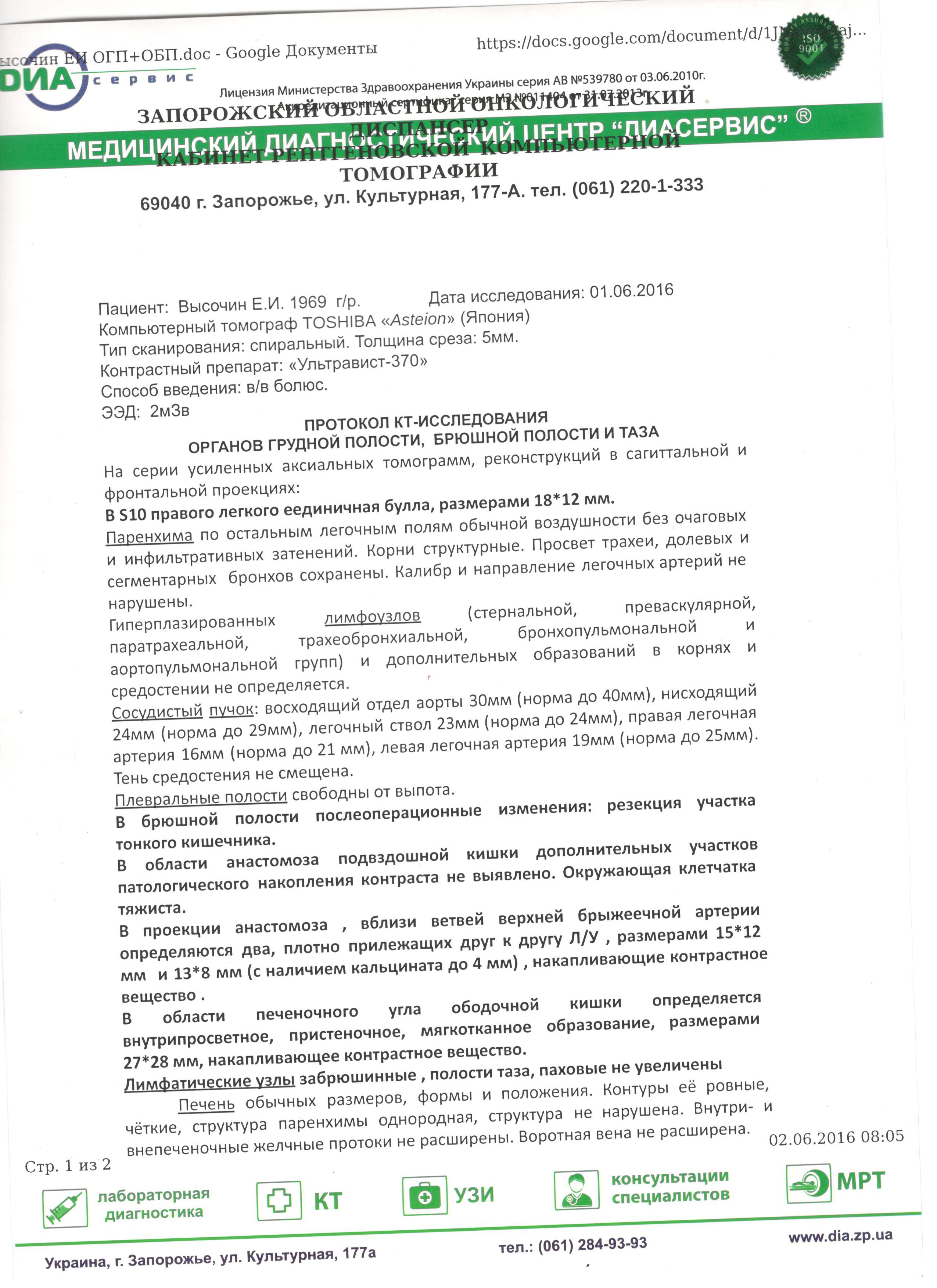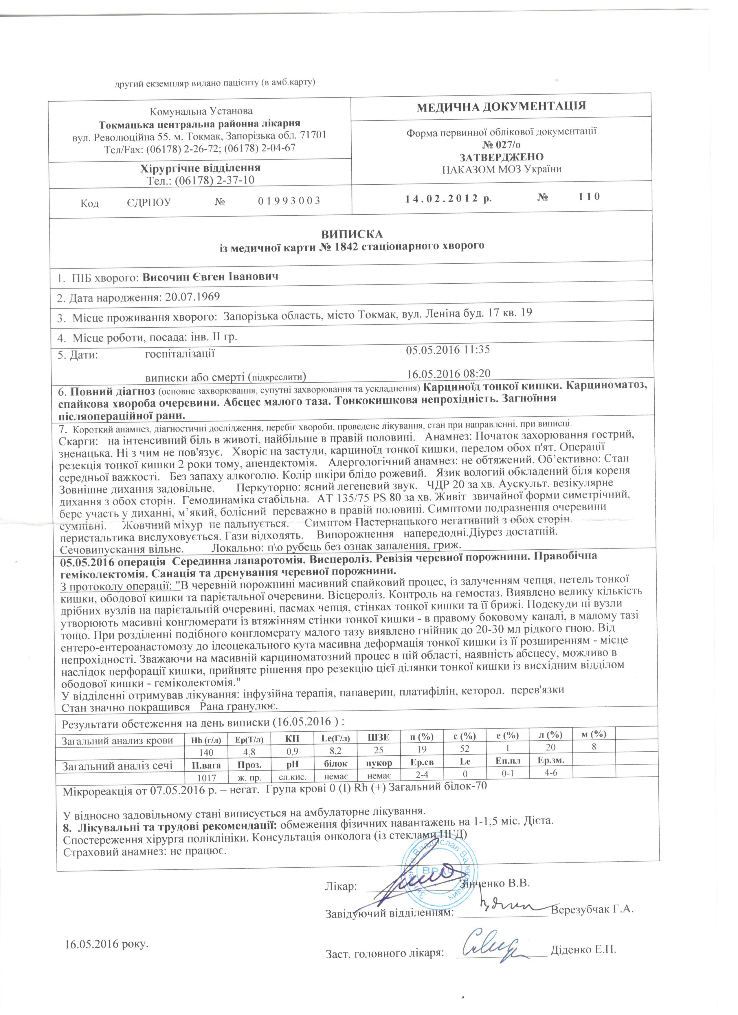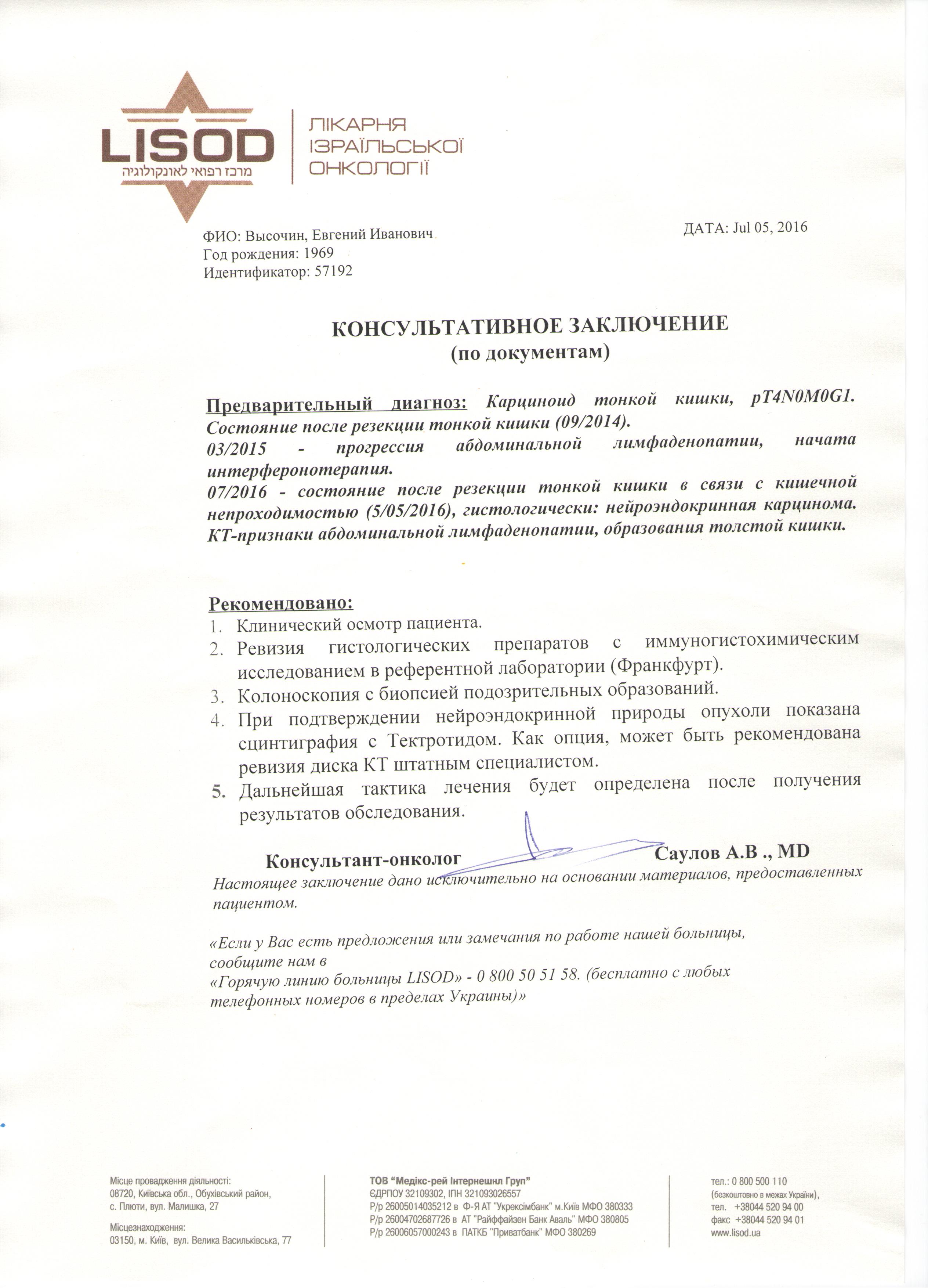 В сентябре 2014 года был прооперирован в связи с непроходимостью кишечника, после чего был поставлен диагноз: Карциноид тонкого кишечника. В дальнейшем поставлен на учет и проходил лечение в Запорожском онкодиспансере. В мае 2016 года наступило обострение, в связи с чем была произведена повторная операция по удалению части кишечника. Предварительный диагноз на сегодня: Нейроэндокринная карцинома кишечника. В данный момент назначена химиотерапия в Запорожском онкодиспансере - поможет хорошо , а если нет - результат не известен, т.к. таким раком у нас болеют единицы