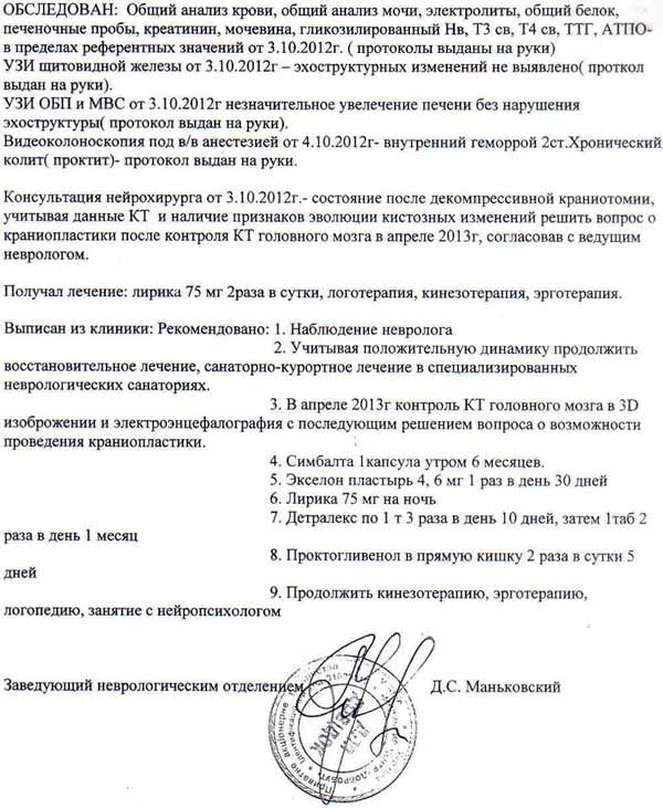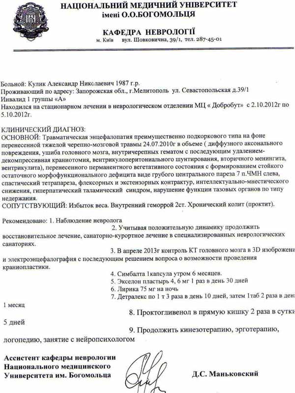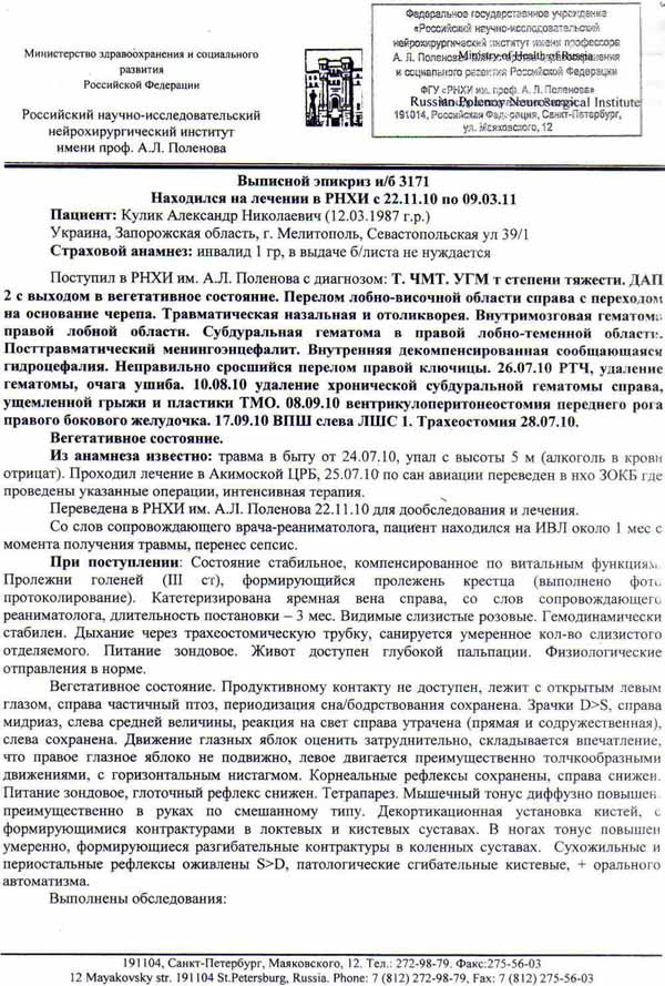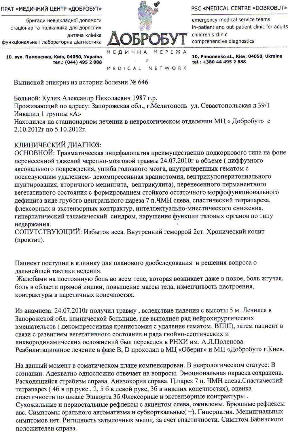 Диагноз: Последствия тяжелой ЧМТ (черепно-мозговой травмы): перелом лобно-височной области справа с переходом на основание черепа, ушиб головного мозга тяжелой степени. Частичная парализация тела.