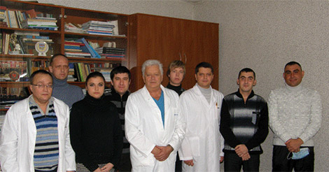 На снимке слева направо: зав. отделением трансплантации Поляков Н.Н., реципиент печени (врач- педиатр, Хмельницкая обл.), реципиент почки (семейный врач, г.Днепропетровск), реципиент почки (г. Запорожье), проф. Никоненко А.С., реципиент почки ( г.Днепропетровск), доцент Никоненко А.А., реципиент сердца (г. Запорожье), реципиент почки (г. Запорожье).