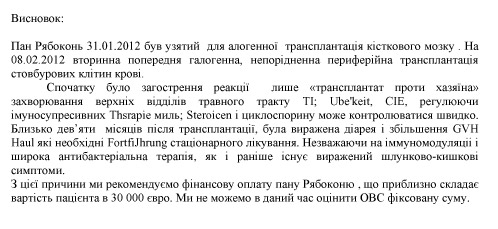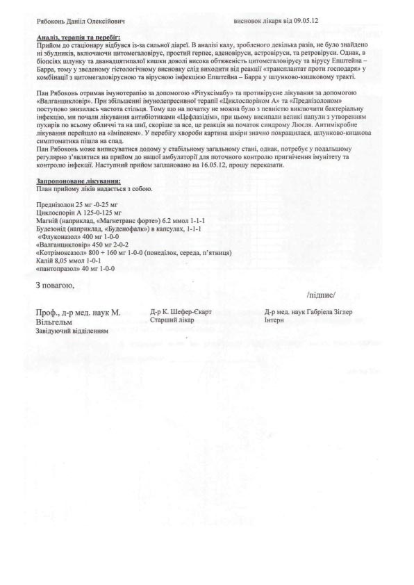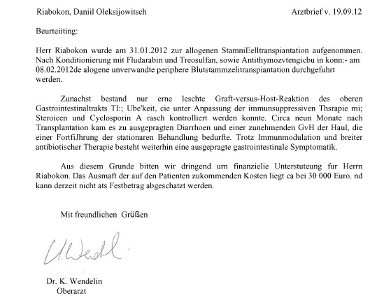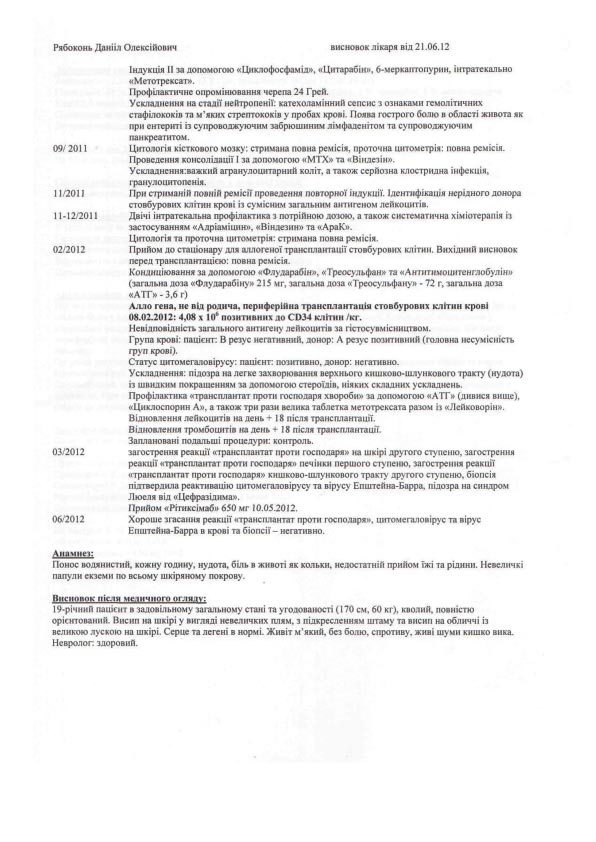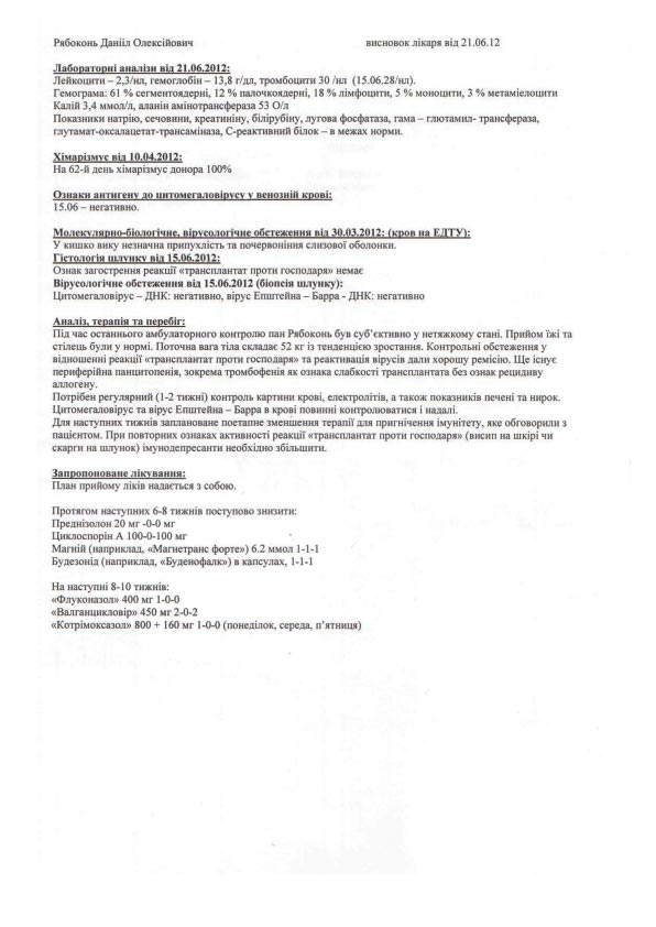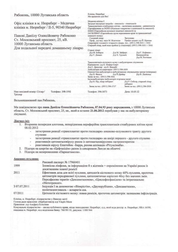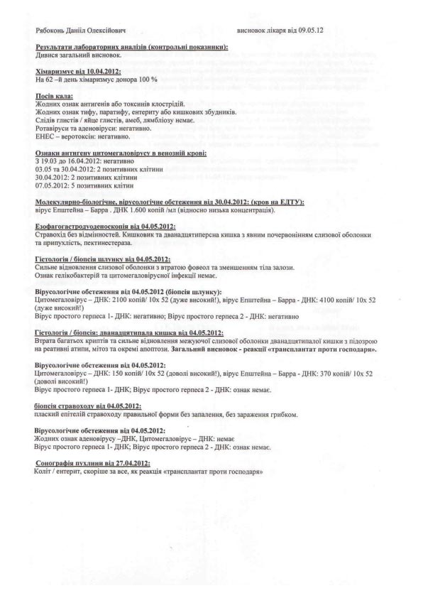 На сегодняшний день у Даниила возникли осложнения, и мы вынуждены обратится к вам за помощью. На открытых нами счетах – нули, и все дальнейшее лечение под вопросом. Обращаюсь ко всем, кто может нам помочь, откликнутся на нашу беду, заранее спасибо! На сегодняшний день речь идет о 30 000 евро, 13 000 из которых мы должны погасить в Нюрбергскую клинику «Норд». Остальная сумма требуется на диагностику и лечение, так как на сегодняшний день мы имеем РТПХ (реакция трансплантата против хозяина) и вынуждены консультироваться и отправлять материалы на диагностику в Германию. К огромному сожалению, менее 50% анализов, которые нам необходимы - не делаются в Украине (например: определение РТПХ, или работу донорского трансплантанта), также требуется прием дорогостоящих препаратов, имуносупрессия, противовирусные. Сейчас РТПХ осложняется у нас острым язвенным колитом.»