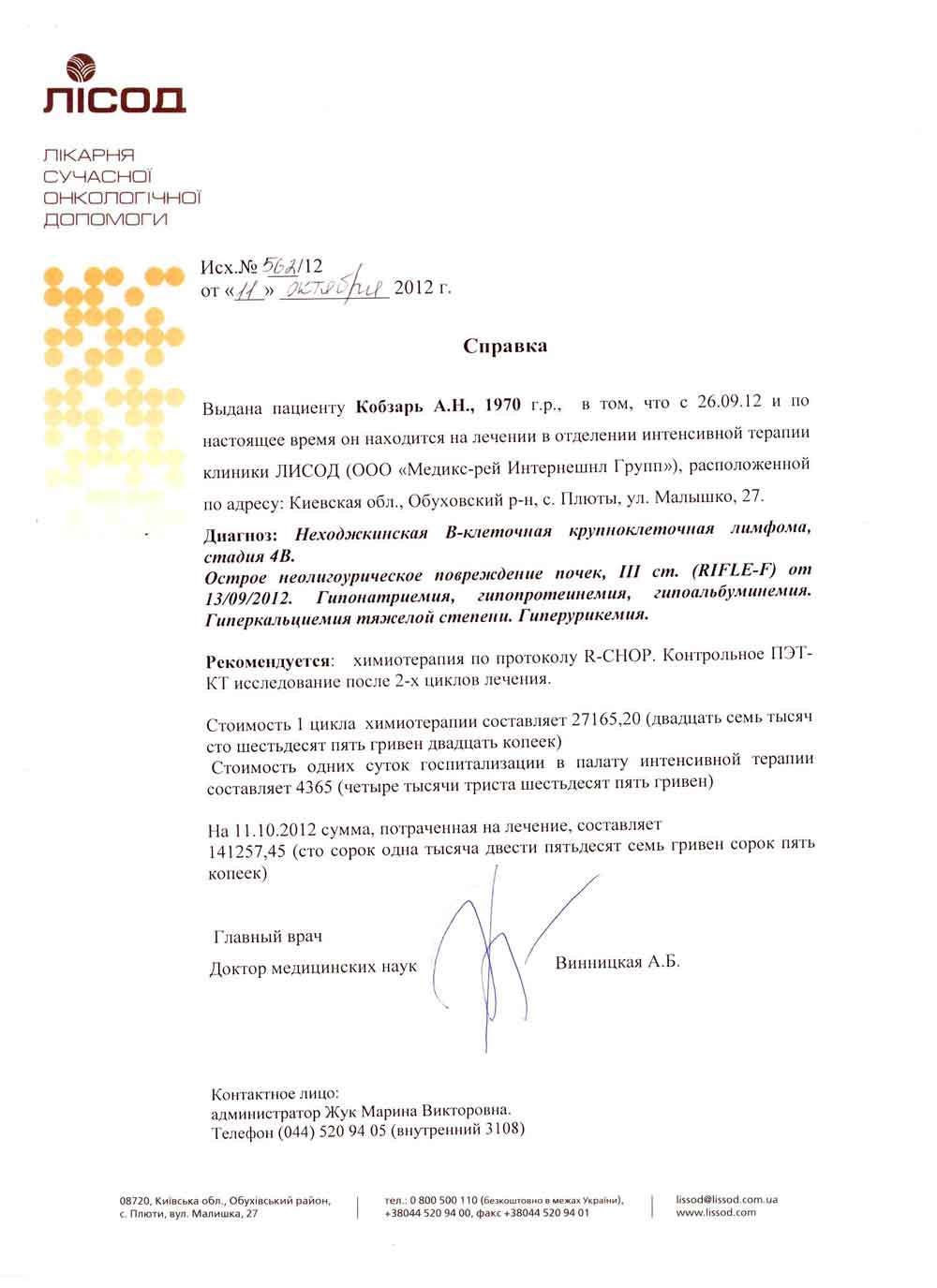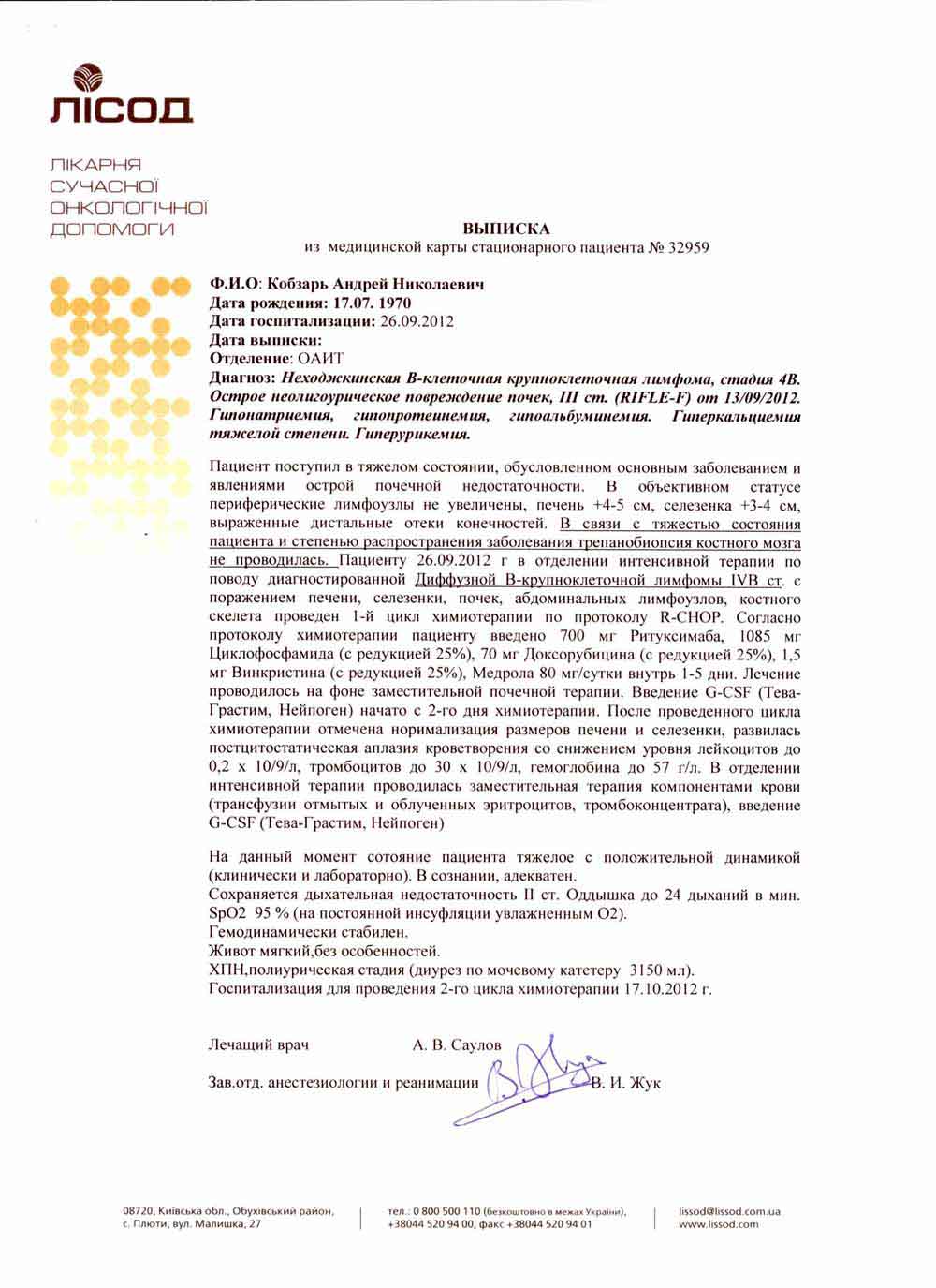 Киевский городской клинической онкологический центр не может принять Андрея в столь тяжелом состоянии из-за отсутствия ряда необходимой для оказания ему медицинской помощи аппаратуры. После ряда консультаций врачи КГКОЦ и клиники «Лисод» приняли совместное решение о том, что 2 курса химеотерапии он должен пройти в «Лисоде», а затем, если будет позволять состояние, Андрея переведут в онкологический центр для продолжения лечения.