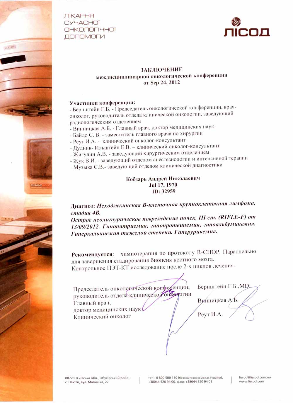 На семейном совете мы решили обратиться в больницу современной онкологической помощи «Лисод». Несколько дней мы находились в клинике, так как Андрею становилось всё хуже, и мы боялись забирать его домой. Затем у него стали отказывать почки, и после консультации нефролога нам срочно пришлось перевезти его в институт Амосова в отделение реанимации для проведения диализа – подключение к аппарату искусственной почки. В это время нам позвонили из «Лисода», и сообщили диагноз – «Неходжинская Лимфома стадия 4В», нужно срочно делать химиотерапию... Делать её в таком тяжелом состоянии – большой риск, но если её не начать, риск для жизни был бы намного более высоким!