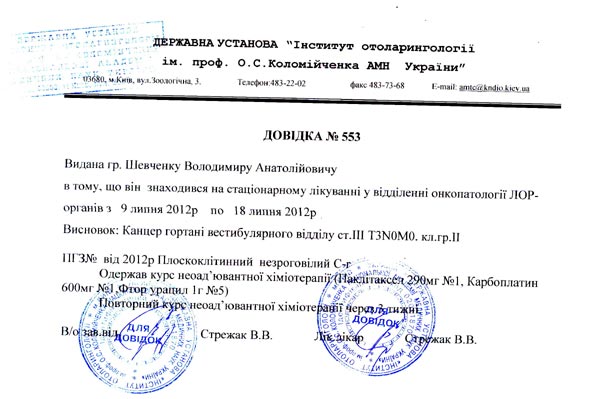 Новости о лечении Шевченко Владимирa