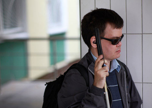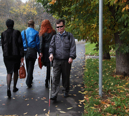 Идя по улице, Сергей палочкой для слепых находит опору в виде бордюра или забора и двигается вдоль