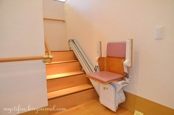 9. Подъемное устройство для лестницы. Пересесть с коляски, опустить подлокотники, пристегнуть ремень безопасности - и можно с комфортом отправляться наверх. Вдоль коридора идут поручни.