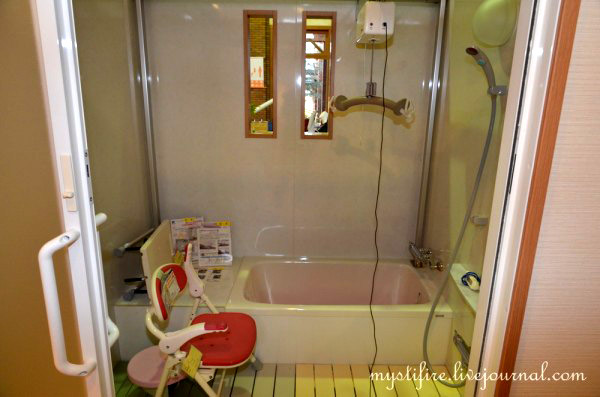 Прежде чем войти в наполненную горячей водой офуро, японцы тщательно моются под душем, сидя на специальном стульчике (красный) или тумбочке (розовая слева)