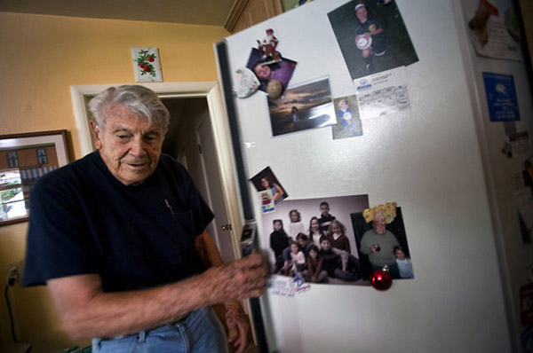 9. Джин кладет продукты для ужина в холодильник, дверь которого обклеена фотографиями их внуков. (Manny Crisostomo)