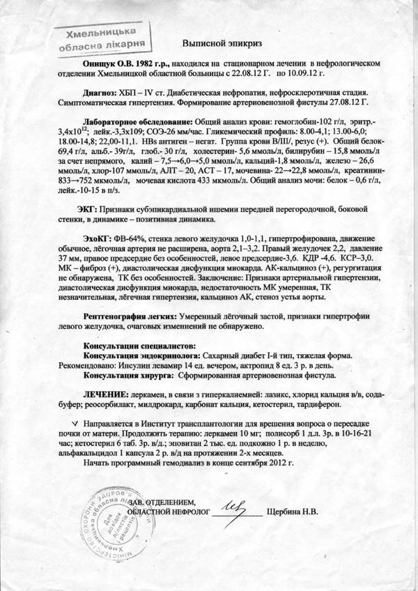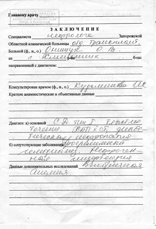 Диагноз: Состояние после трансплантации почки