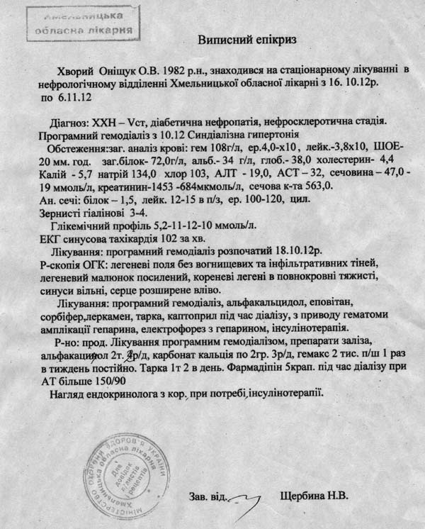 Парень внесен в лист ожидания донорской трупной почки в Запорожском институте трансплантологии, на эту операцию необходимо порядком 10000 гривен. Олега могут вызвать в любой момент, как только появится трупная почка. Счет институт трансплантологии заблаговременно не предоставляет, только говорят приблизительную сумму, по причине того, что сумма может варьироваться от показателей организма непосредственно перед самой пересадкой.