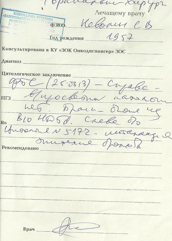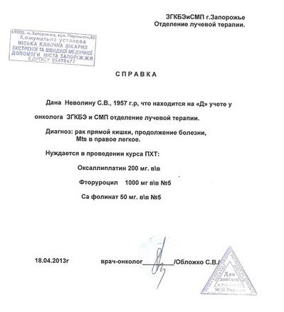 С октября 2012 года, после обследования у врача, выявлены в обоих легких метастазы. Опухоль в левом легком стремительно растет, в диаметре она уже достигла 8 см. Сейчас он находится на постоянном лечении, уже сделано 3-и химиотерапии. Все обследования и лечение не из дешевых, семья уже набралась кредитов, у них нет денег на то, чтобы рассчитаться еще по первой операции.