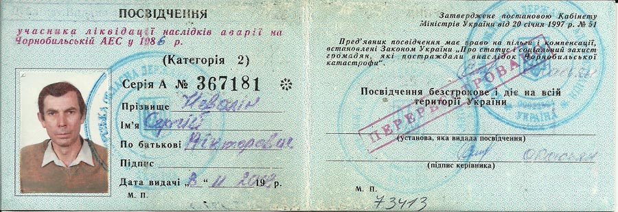 Удостоверение ликвидатора аварии на ЧАЭС: 1 стр. 2 стр.