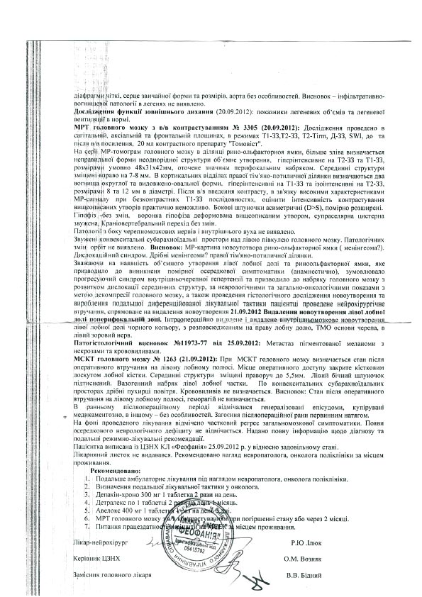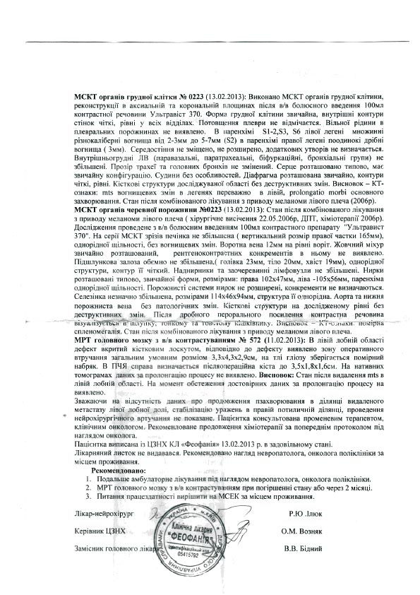 Лікуватися потрібно протягом року такими препаратами, як ТЕМОДАЛ, ціна якого на один курс близько 13 тисяч гривень і БІОФЕРОН, вартість якого приблизно 1800 грн. на місяць. Паралельно потрібно постійно приймати гепатопротектори та кардіостимулятори. Рекомендовано продовжити хіміотерапію за попереднім протоколом під наглядом онколога.