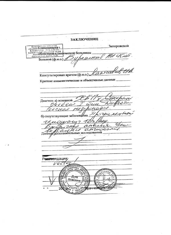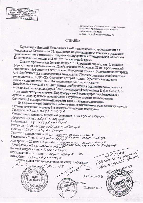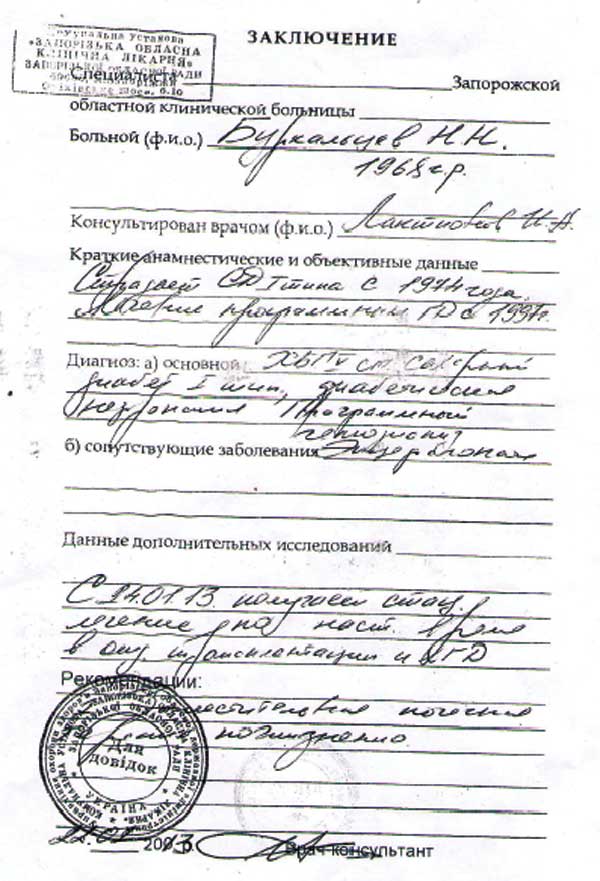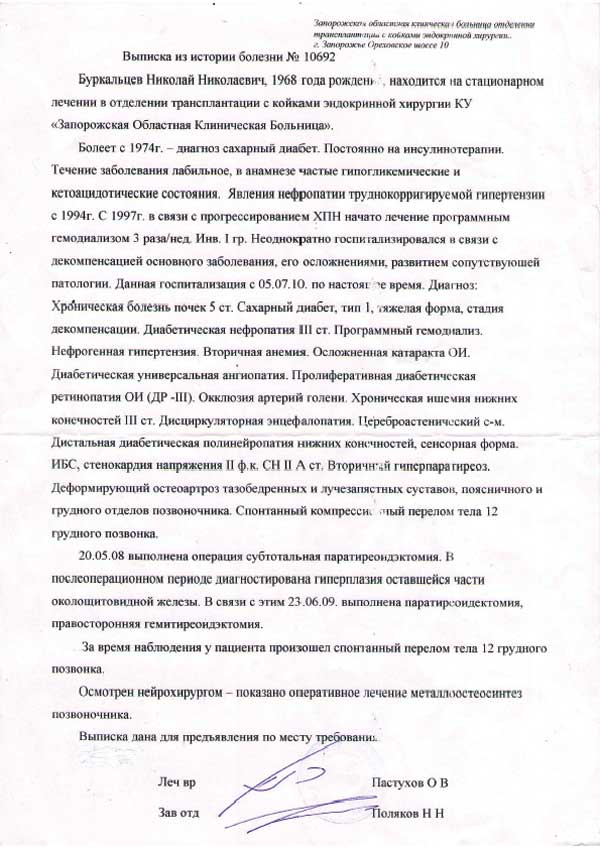 Диагноз: Хроническая болезнь почек 5ст., сахарный диабет 1тип, тяжелая форма, осложненная катаракта.
