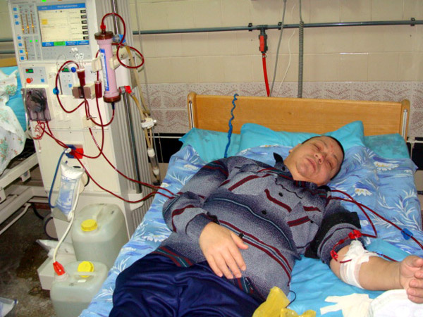 На аппарате искусственной почки он проходит эту процедуру 3 раза в неделю по 4 часа. Это очень тяжелая процедура, после нее сильные судороги по всему телу, резкий перепад давления, рвота и многое других побочных результатов.