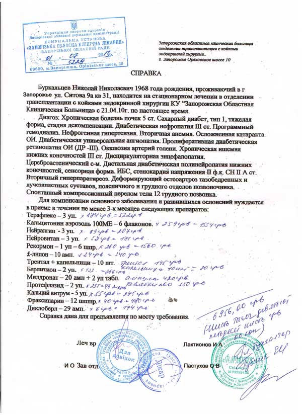 Николай Буркальцев находится в Запорожской областной больнице, отделении трансплантации и хронического гемодиализа.