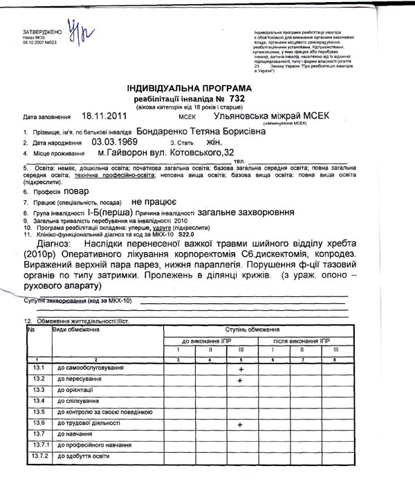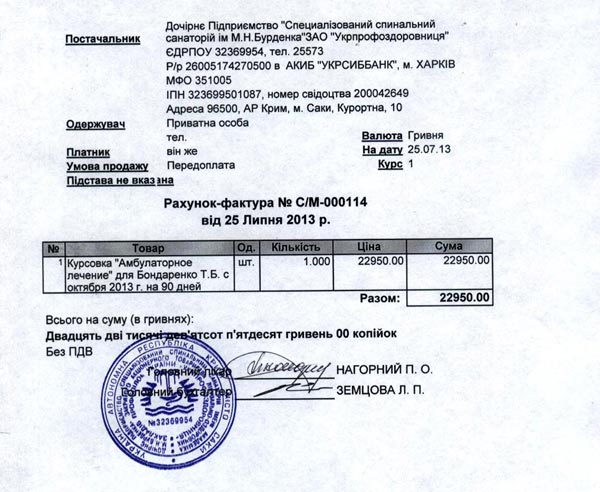 Татьяне врачами рекомендована реабилитация в санатории им. Бурденко, г. Саки. По словам специалистов, три месяца реабилитации смогут существенно изменить ситуацию. Стоимость курсовки на 90 дней составляет 22 950 гривен. В стоимость включено только медицинское обслуживание и процедуры, проезд, проживание, питание семья постарается оплатить самостоятельно. Заезд на реабилитацию в октябре, а это означает, что до октября месяца нам совместными усилиями необходимо собрать сумму.