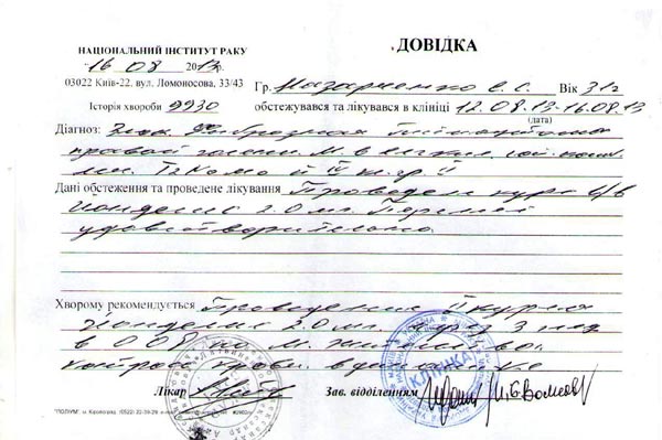 Но сейчас его состояние здоровья сильно ухудшилось… На данный момент у Жени в правом легком метастаз, и 06.08 этого года, на томографии был обнаружен очаг в культе (оставшемся участке ноги), который теперь нужно ампутировать. Жене необходимо дорогостоящее лекарство Йонделис, его стоимость 20 000 гривен за ампулу, также ему расписана новая химиотерапия. Новое лечение было назначено врачами Киевского Национального Института Рака.