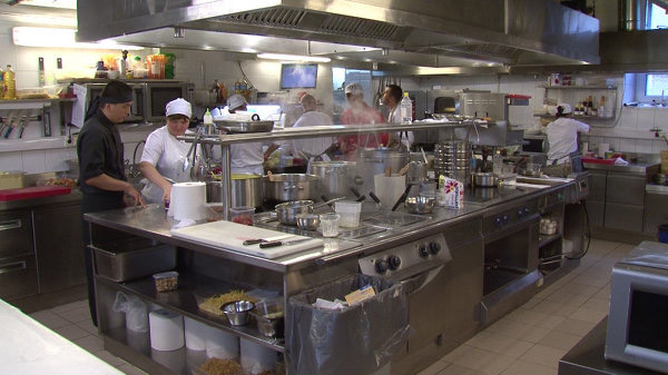 Светлая, блестящая, просторная кухня, на которой одновременно работают чуть больше десятка людей, разделена на две части — горячий и холодный цеха. С утра здесь довольно тихо, заказов до полудня в центре Москвы не много. Сотрудники кафе винят дождь и осень — время легких завтраков на открытых верандах закончилось. В холодном цехе в это время делают заготовки: моют овощи, крошат красный перец чили. 23-летний Никита, один из поваров в холодном цеху, сосредоточенно нарезает лосося мелкими кубиками — для будущих салатов и сендвичей.