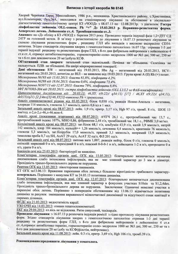 В июле 2012 года внезапно умирает старший брат Тараса. Для всей семьи – огромное потрясение. Тарас тяжело переживал смерть брата. Может быть, на это и списывались сначала проблемы со здоровьем. Но через 9 месяцев парень услышал от врачей: "у вас рак крови". Шок, страх, растерянность – все прошла эта семья. Но врачи обнадеживали – шанс на излечение есть, нужно бороться. И они боролись. Дорогостоящие лекарства… для семьи, в которой до того момента именно Тарас был кормильцем – просто катастрофа. Но на помощь приходили друзья, знакомые, односельчане. Каждый – сколько мог. И шаг за шагом Тарас прошел три курса химиотерапии.