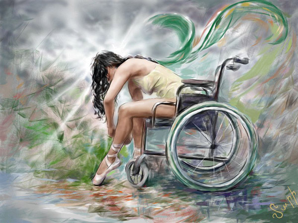 - Марианна, меня очень поражает одна из твоих картин, где девушка в пуантах, сидит в инвалидном кресле. Это картина просто лишила меня дара речи. Этот образ мне невероятно близок. Как человек с физическими ограничениями, я прекрасно понимаю, что означает мечтать вопреки преградам. Какую идею ты пыталась изобразить в этой картине?