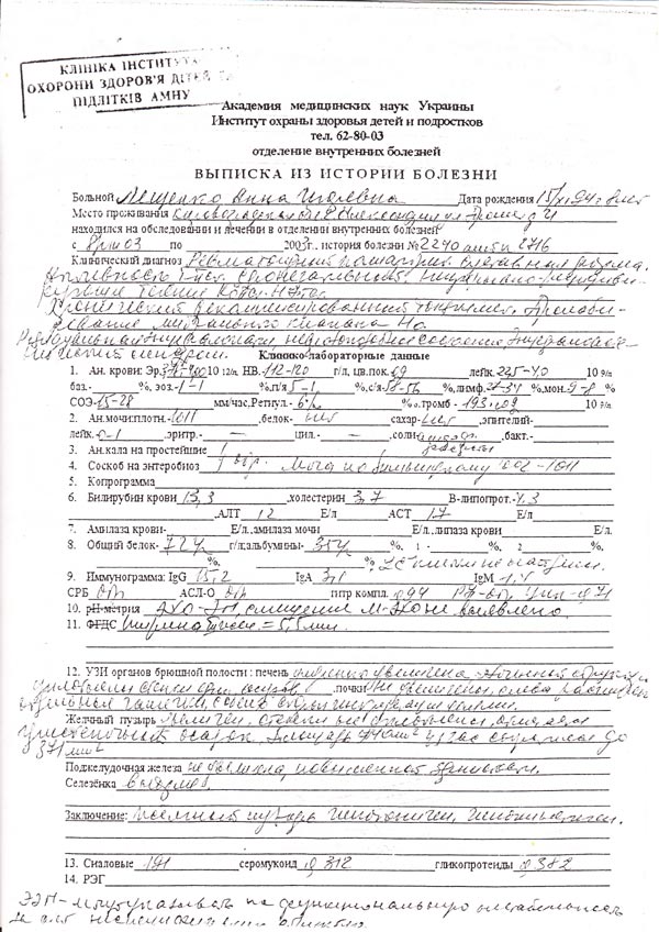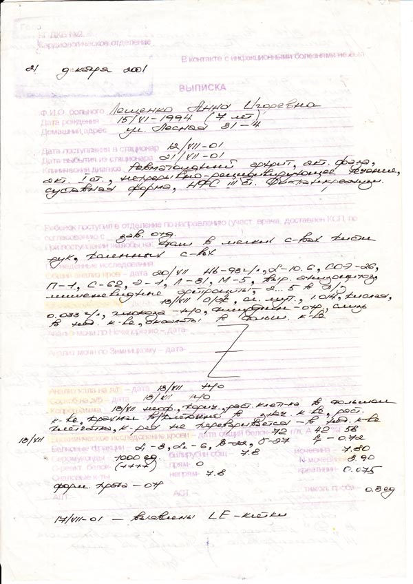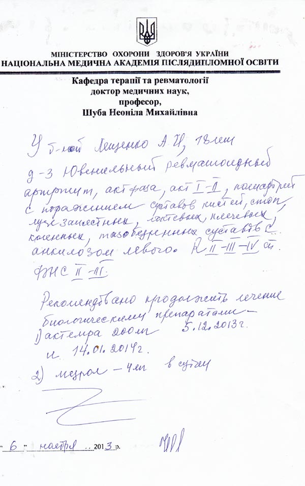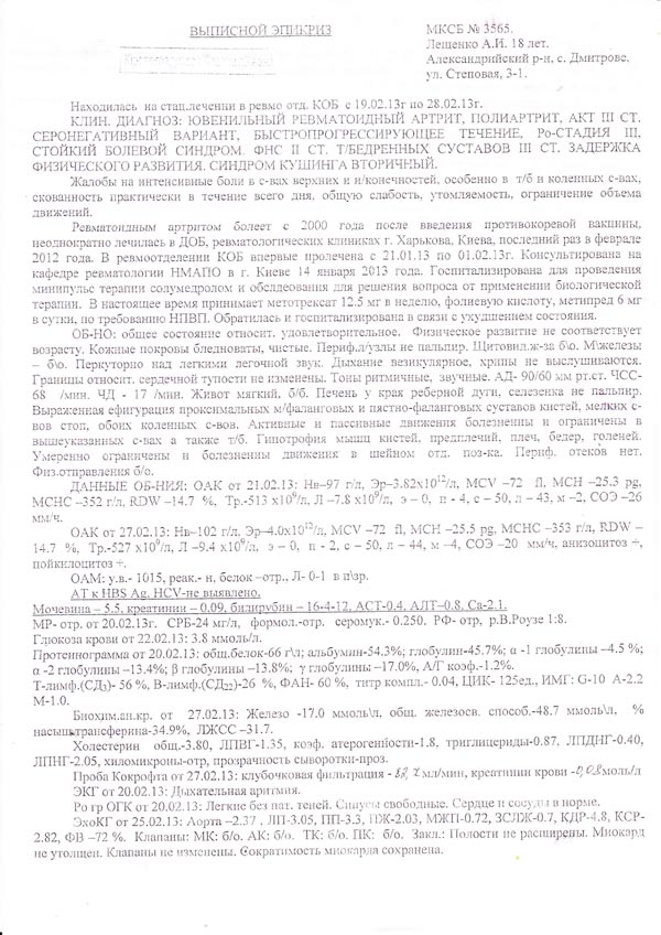 Здравствуйте! Обращается к Вам мама Лещенко Ани. Моя дочь Аня болеет уже 14 лет, впервые заболела, когда ей было 5 годиков. Все эти годы были очень тяжелыми для неё, никакой детской жизни (побегать, поиграть с другими детьми) у неё не было, она была прикована к постели невыносимой болью, температура повышалась до 38 градусов и выше, не могла взять ложку в руки, пальцы наливались и очень болели, я её кормила и носила на руках. Обучалась все эти школьные годы дома на индивидуальном обучении. Уже в 6 лет была инвалидом детства.