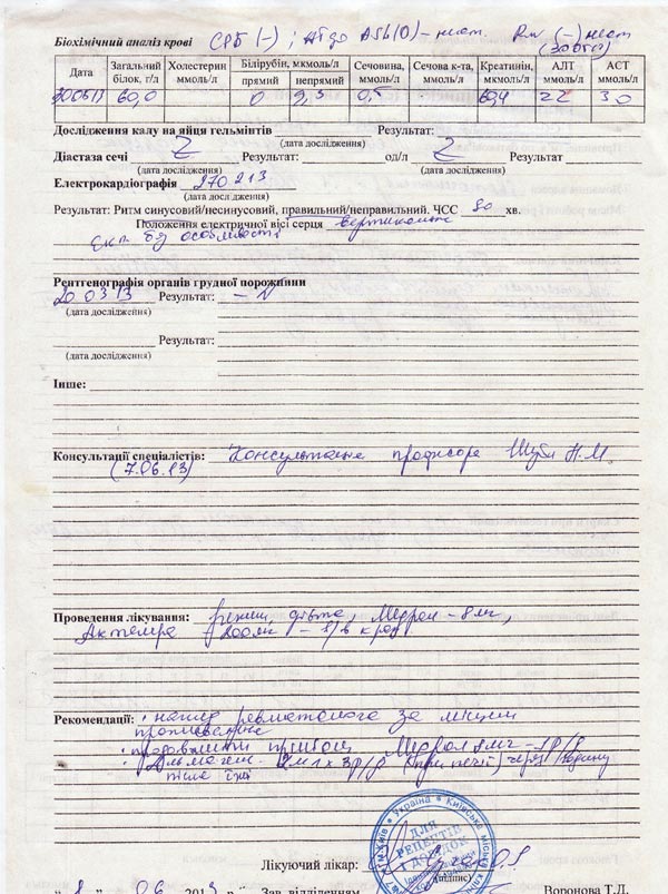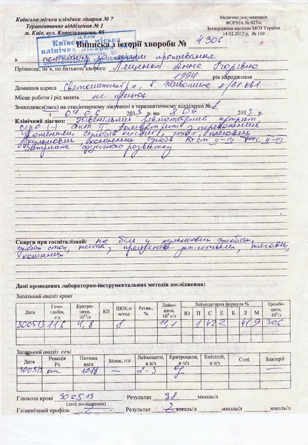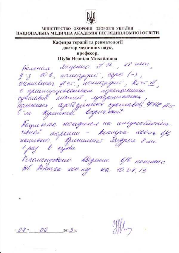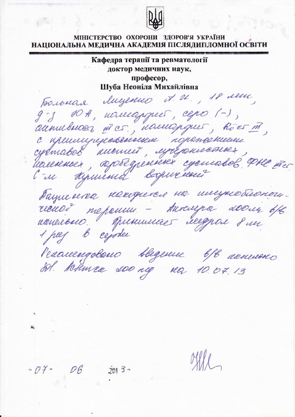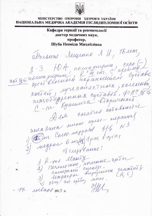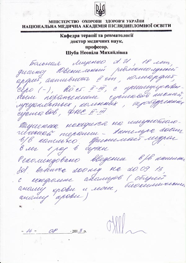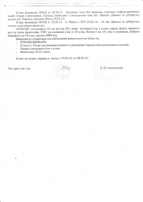 Я лечила и воспитывала двух дочек самостоятельно. Их отец ушел, у него другая семья, он не интересуется детьми и не помогает в лечении. Все эти годы Анюту как могла лечила, хваталась за каждую возможность. Все 14 лет она на гормонах и обезболивающих препаратах, но от них вреда не меньше, постоянные проблемы с печенью и желудком, в то же время отказаться от гормонов не можем, так как очень сильное обострение! В 2011 году мы узнали о препарате Актемра, отзывы были хорошие. До ноября 2012 года мы готовились к капельнице с Актемрой. В ноябре Ане исполнилось 18 лет и все, к чему мы стремилась, надеялись - улетучилось. В 18 лет дети не могут получать бесплатно этот препарат. В январе 2013 г. состояние дочки очень ухудшилось, никакое лечение не помогало. В феврале после консультации с профессором Шубой Н.М. мы снова обрели надежду, она уже много людей лечит этим препаратом и они очень довольны, она и нам посоветовала начать эту терапию. В мае после всех обследований нам начали капать этот препарат - прогресс есть, анализы начали нормализоваться и отечность уже не такая сильная.