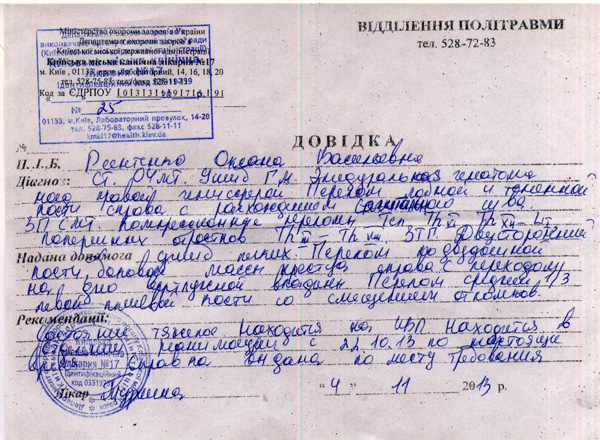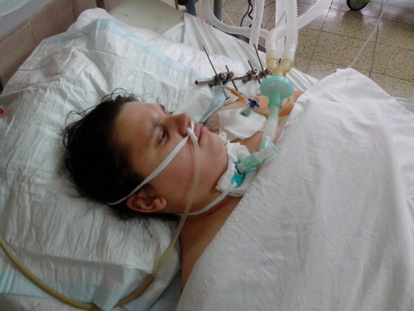 Два месяца молодая женщина провела в реанимации 17-й гор.больницы г. Киева на ИВЛ (искусственной вентиляции легких). За это время врачи сделали все возможное для спасения ее жизни. Оксане была проведена операция по укреплению позвоночника, в левую руку была установлена пластина. Теперь в этой операции нуждается и левая нога Оксаны, раздробленная в нескольких местах. Без нее, по прогнозам врачей, Оксана навсегда может остаться прикованной к постели.