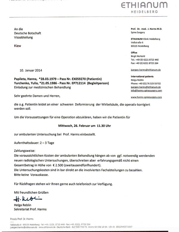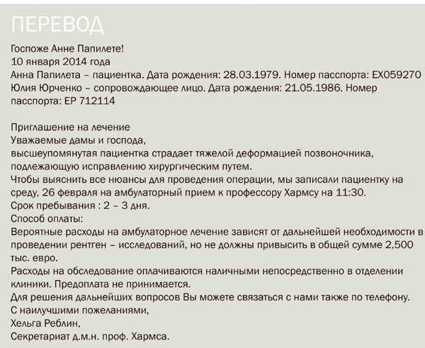 Письмо-приглашение на обследование в немецкую клинику (немецкая версия): 1 стр. Русская версия (перевод): 2 стр.